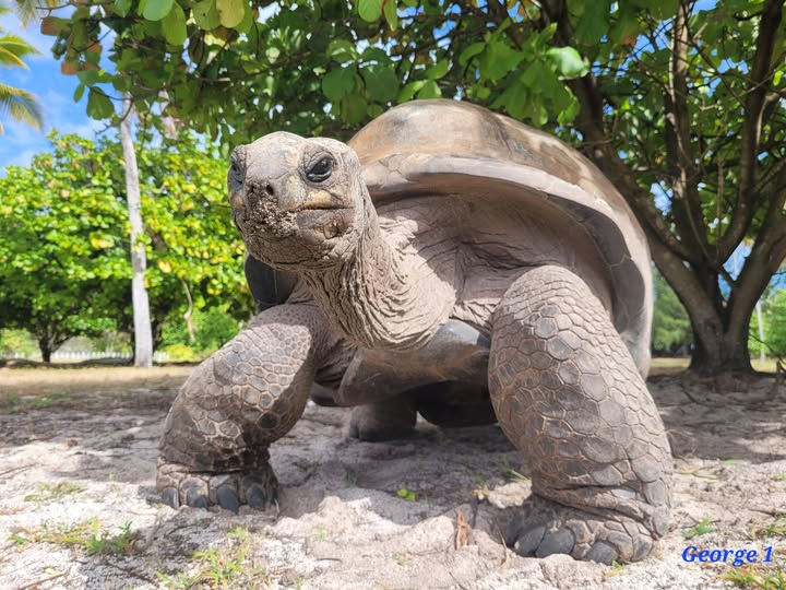 Seit seinem Eintreffen im neuen Zuhause vor einigen Jahren ist George das inoffizielle Wahrzeichen der Insel Desroches und Liebling von Einheimischen und Touristen gleichermaßen. Um das Wohlergehen und den Schutz der Riesenschildkröten kümmert sich das Team der örtlichen Aufzuchtstation – und tatsächlich ist es in den vergangenen Jahren gelungen, die Population der beeindruckenden Tiere vor Ort wieder zu erhöhen.