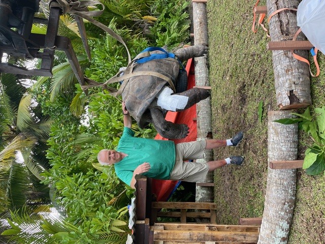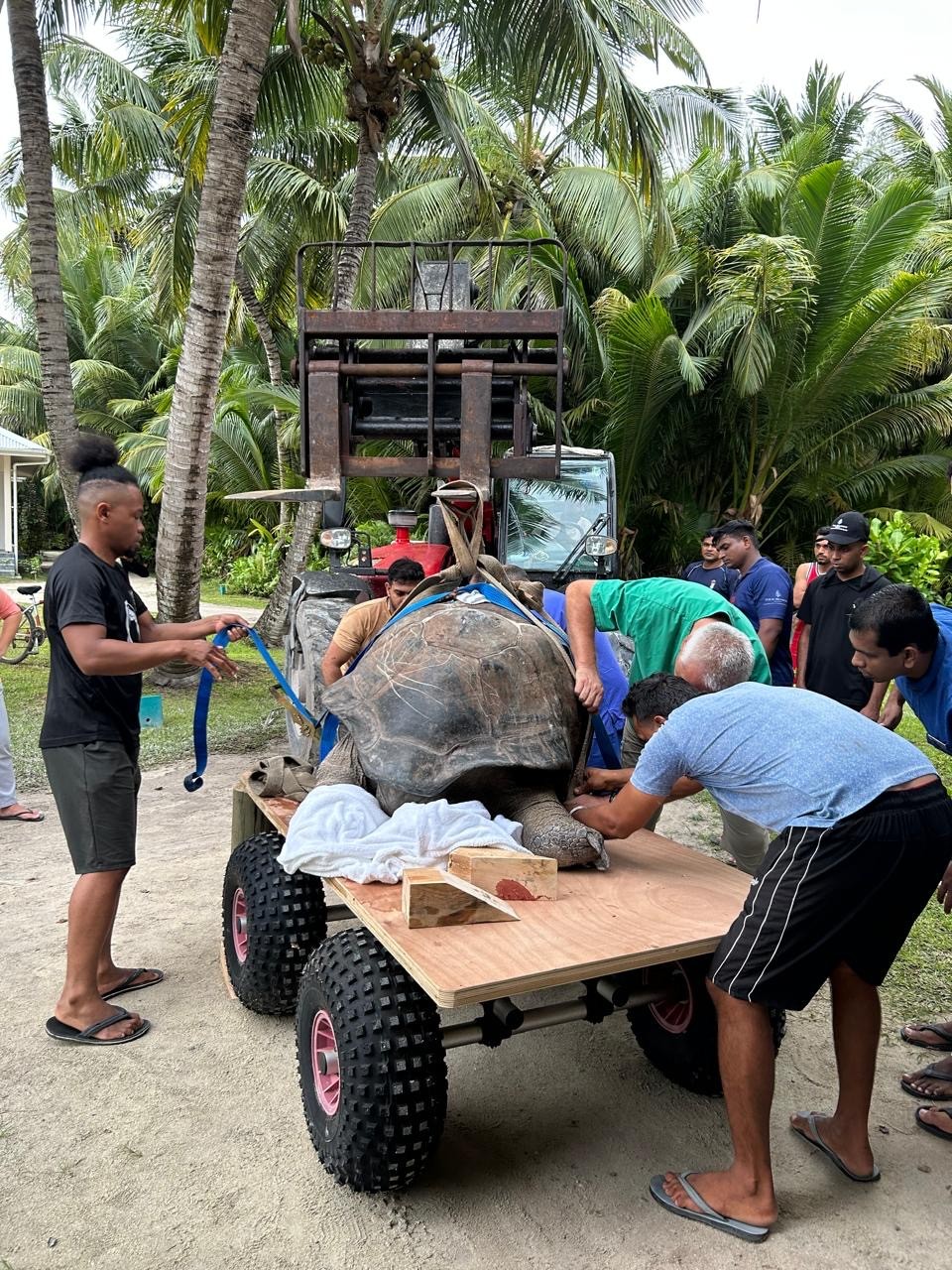 Am 12. Januar treffen die Helfer, die ihre spezielle medizinische Ausrüstung zuvor in ein Kleinflugzeug umgeladen hatten, auf Desroches ein. Erwartet werden sie bereits von Verantwortlichen der Island Conservation Society Seychelles, der für den Ausbau der Infrastruktur und den Naturschutz auf der Inselgruppe zuständigen Behörde. Zudem ist die gesamte Bevölkerung der Insel, rund 200 Einwohnerinnen und Einwohner, auf den Beinen. Alle wollen am Schicksal ihres geliebten „Inselmaskottchens“ teilhaben und Zeugen seiner Rettung sein.