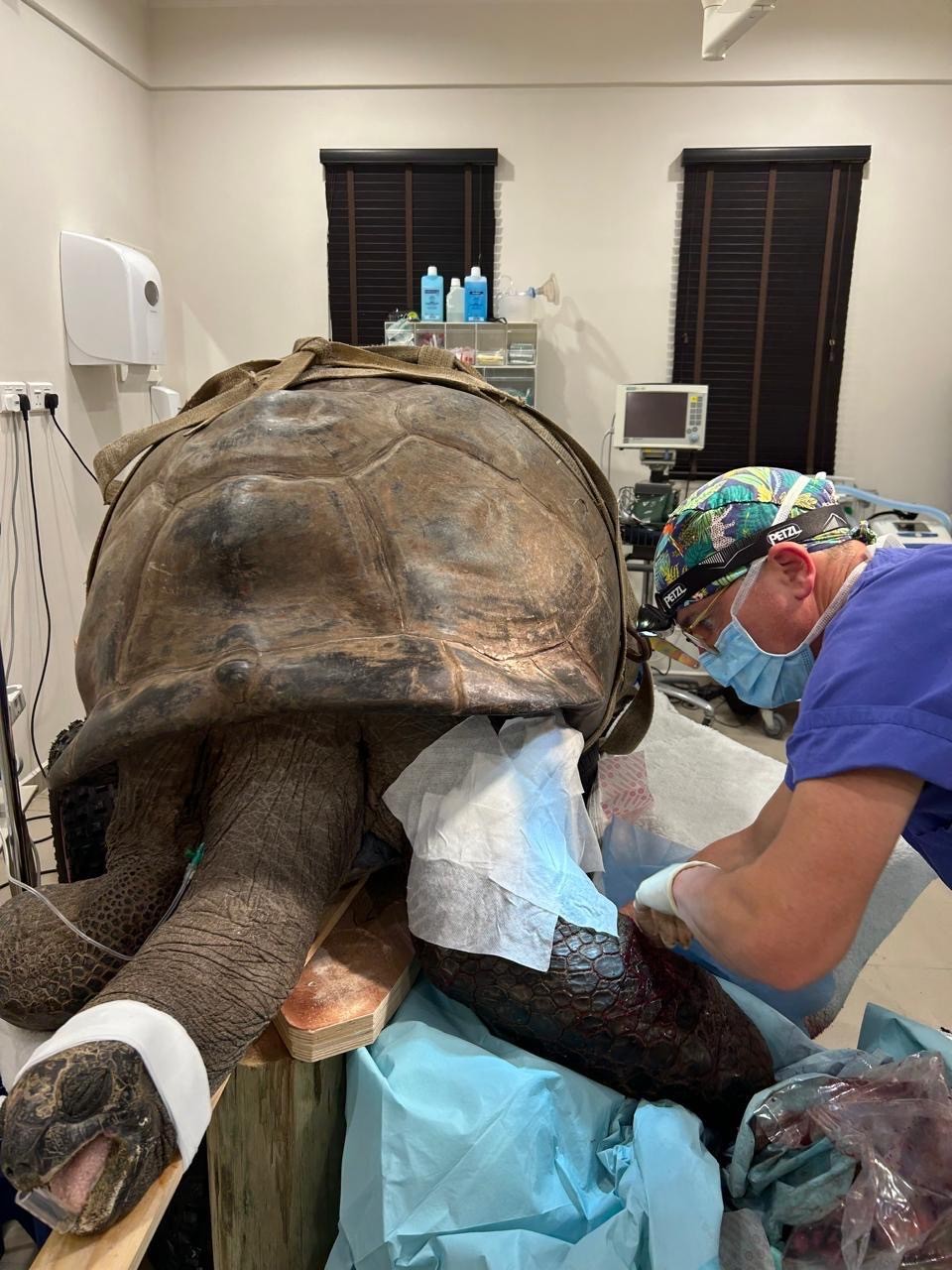 Am 9. Januar erhält Dr. Hendrik Liedtke einen Anruf seines Kollegen Dr. Lukas Kamarad. Der österreichische Allgemeinmediziner und Urologe ist derzeit als „ResortDoc“ auf den Seychellen im Einsatz und eng mit dem Inselleben verbunden. Dr. Liedtke erzählt: „Die Schilderung des Kollegen machte den Ernst der Lage sofort deutlich. Riesenschildkröte George habe eine schwere Verletzung erlitten. Zwar sei nicht klar, woher die Verletzung stamme, jedoch sei die Schildkröte nicht mehr bewegungsfähig.“ Kamarad konnte mit Hilfe des Röntgengerätes sofort die Diagnose stellen – es lag ein Bruch des linken Vorderarmknochens vor. Eines war klar: Sollte es nicht gelingen, George schnell und fachgerecht zu behandeln, würde das weltweit bekannte und seltene Tier sterben.