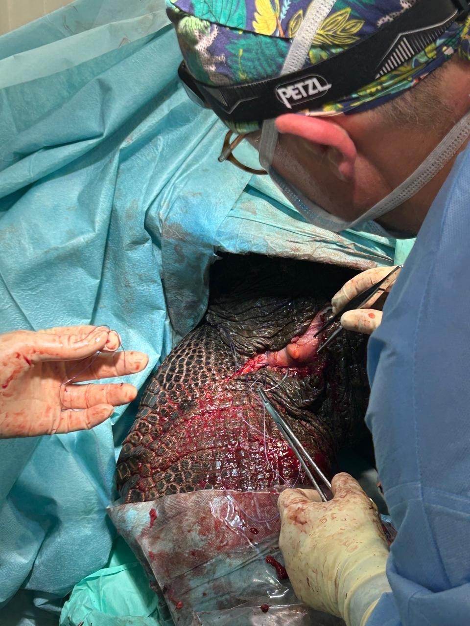 Nun beginnt die Arbeit: Um den schwergewichtigen Patienten – George wiegt fast 300 Kg – überhaupt röntgen und operieren zu können, muss ein geeigneter OP-Tisch her. Diesen konstruieren die Helfer in einer örtlichen Werkstatt aus einer auf großen Gummireifen montierten Holzplatte. Um das verletzte Reptil auf die Holzkonstruktion heben zu können, muss ein Gabelstapler organisiert werden. Die Fraktur im Oberarm wird zum Teil verdeckt durch den gewaltigen Panzer, was den Zugang für die beiden Operateure erschwert. Wie beim Menschen soll der Knochenbruch durch eine Osteosynthese, eine operative Fixierung mit Platten, Schrauben oder Nägeln, versorgt werden. Dr. Thielebein verabreicht George eine speziell auf große Reptilien abgestimmte Narkose und lagert ihn sicher auf dem improvisierten OP-Tisch. Kurz darauf ist George eingeschlafen und atmet ruhig. Der Eingriff, den die beiden Ärzte gemeinsam durchführen, dauert fast fünf Stunden. Als die Wunde schließlich verschlossen ist, stellt sich die Frage, wie die erforderliche, mehrwöchige Ruhigstellung gewährleistet werden kann. Auch hier wird erfolgreich improvisiert: Ein aufgeschnittener Autoreifen und LKW-Spanngurte dienen als Schutz und Schiene für das frisch operierte Vorderbein der Riesenschildkröte.