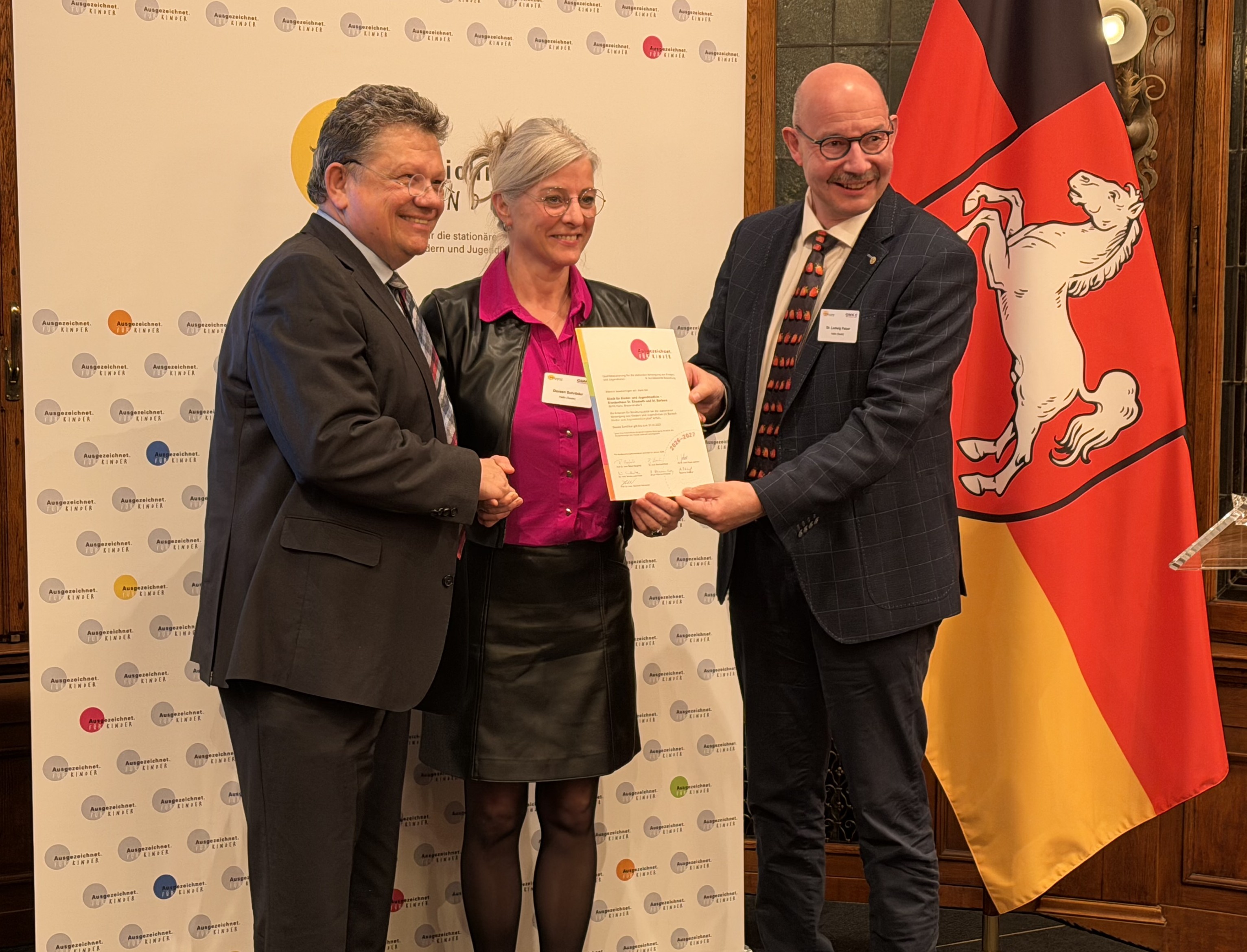 Das Kinderzentrum am Krankenhaus St. Elisabeth und St. Barbara Halle (Saale) hat erneut das Gütesiegel „Ausgezeichnet. FÜR KINDER“ erhalten. Für alle beteiligten medizinischen Fachbereiche nahmen Chefarzt PD Dr. med. Ludwig Patzer und die stellvertretende Pflegedirektorin Doreen Schröder die Auszeichnung in Hannover entgegen. Schirmherr der Aktion ist in diesem Jahr Niedersachsens Gesundheitsminister Dr. Andreas Philippi als Vorsitzender der Gesundheitsministerkonferenz. Das Gütesiegel „Ausgezeichnet. FÜR KINDER“ wurde in diesem Jahr zum neunten Mal verliehen.